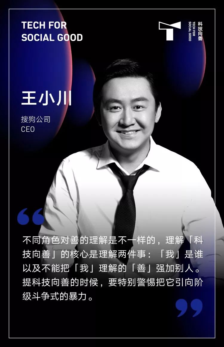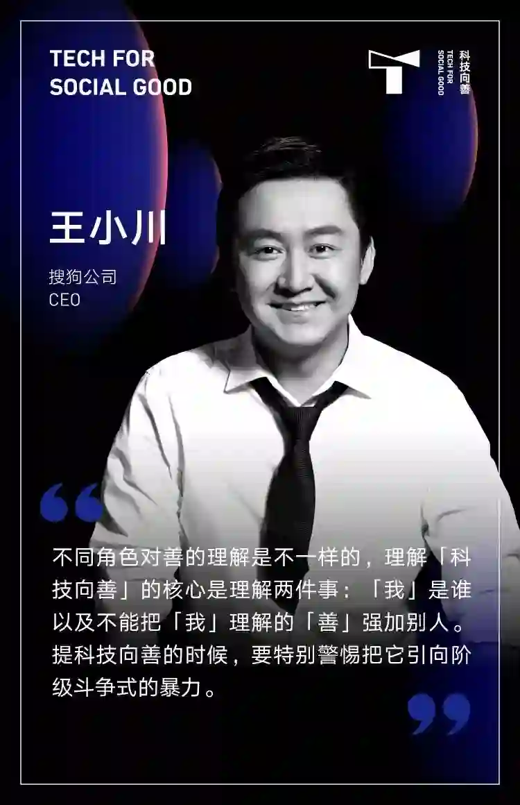 王小川: 不同角色对善的理解是不一样的,比如说极客讲的「善」是:己所不欲,勿施于人。但是CEO要考虑的是企业与社会价值。所以核心是理解两件事情,「我」是谁以及不能把「我」理解的「善」强加别人。提科技向善的时候要特别警惕把它引向「阶级斗争式」的暴力。