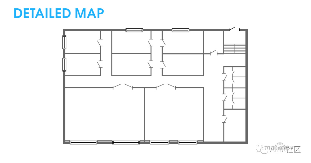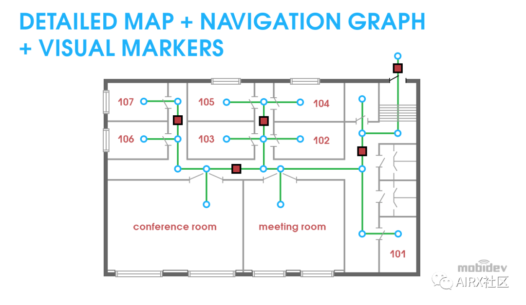下一步添加用于导航的元数据:走廊和房间以创建图形。然后分析周围环境并适当地添加视觉标记,即在入口,大厅,电梯附近等。