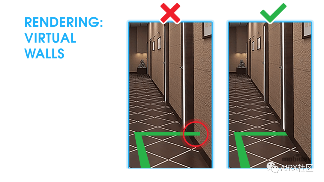 然后,我们使用图论构建路线,并根据坐标绘制折线或箭头(根据设计要求)。但是,使用增强现实在现实世界中绘制路线时会遇到一些挑战。事实是,AR内容始终放置在摄像机图像的顶部,从而产生了将数字内容放置在现实世界中的幻觉。如果绘制了整个路线,它将看起来很奇怪,直接穿过墙壁绘制。