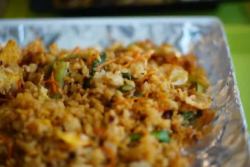顾名思义,锡纸炒饭就是用锡纸垫在盘子上,然后再放上蛋炒饭,这样有一定的保温作用,并且整体看起来会更加高级。不过炒饭口感有点偏咸,可能翻炒过程中会有加料分寸的问题。推荐指数三颗星(五星满分)。