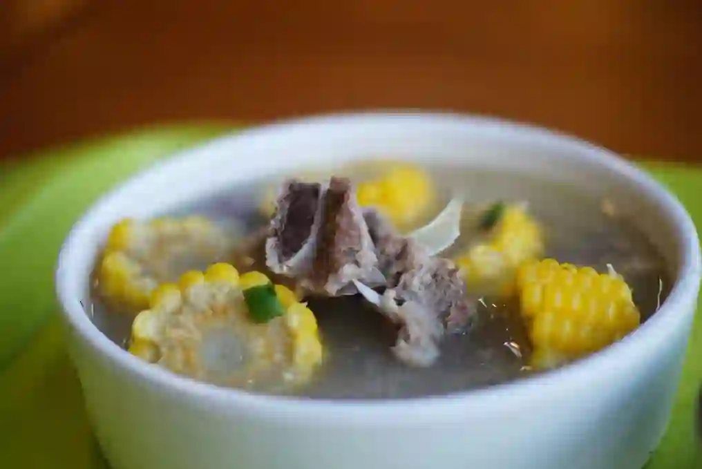 这道菜究竟是叫玉米排骨汤,还是排骨玉米汤,取决于玉米和排骨在这道菜中所占的比例。玉米切块加入炖煮的排骨汤中。试吃时所点的一份骨多肉少,玉米倒是煮得颇烂,两者味道融合得不算好,不如四食堂瓦罐汤。
