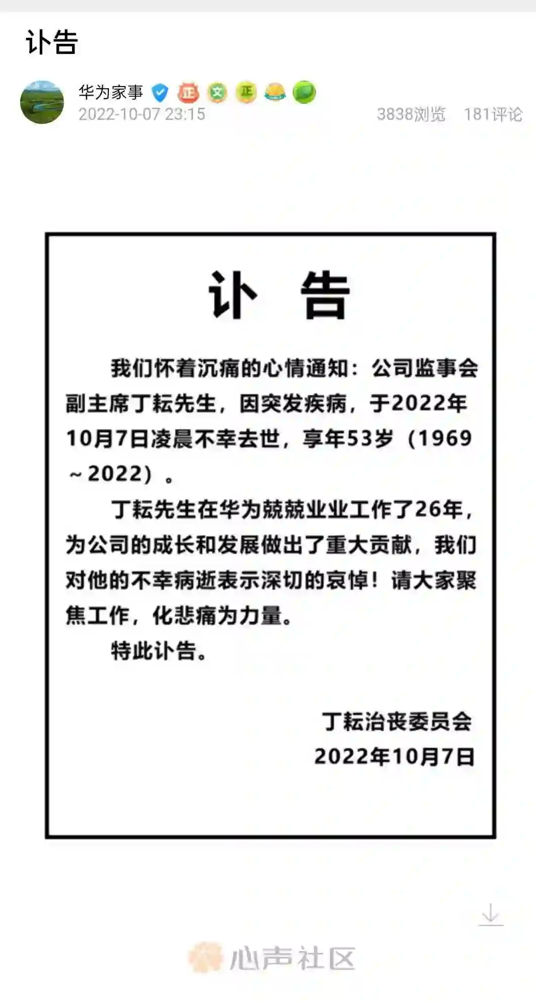 10月7日23点15分,华为在心声社区发布讣告:我们怀着沉痛的心情通知,丁耘因突发疾病,于2022年10月7日凌晨不幸去世,享年53岁(1969~2022)。“丁耘先生在华为兢兢业业工作了26年,为公司的成长和发展做出了重大贡献,我们对他的不幸病逝表示深切的哀悼!请大家聚焦工作,化悲痛为力量。”