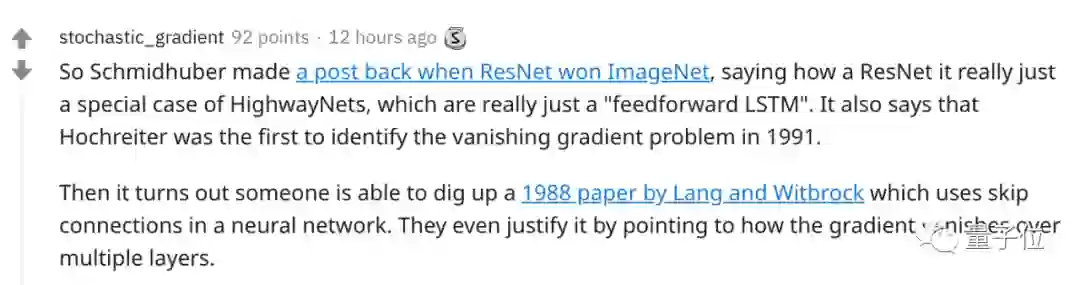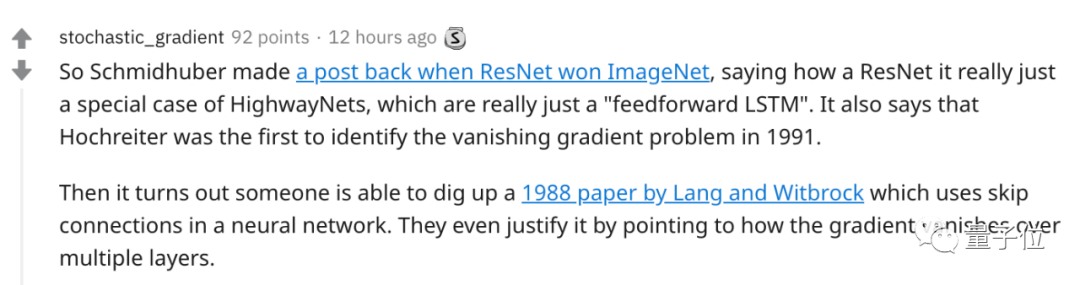 比如ResNet赢得ImageNet竞赛时,Schmidhuber就出来发文说ResNet不过是HighwayNets的一种变体,实际上只是前馈LSTM。他还说Hochreiter在1991年首次发现梯度消失问题。
