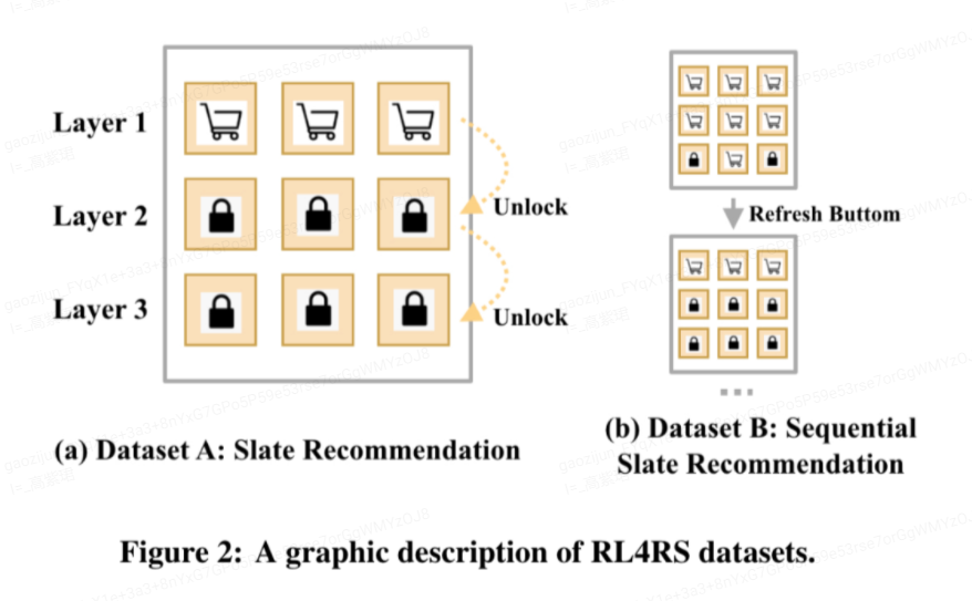 RL4RS包含两个数据集构成,其中每个数据集分别提供了强化学习策略部署前和部署后的用户反馈原始数据。数据集来源于网易游戏的某个交互式解锁商品推荐场景,该场景每次推荐三层商品,每层3个商品,即共推荐9个商品。其交互式解锁规则体现在,用户必须在购买完第k层商品的基础上才能购买下一层的商品。显然,这是一个天然的多步决策场景,用户对单个商品的购买决策不仅受到这个商品的影响,还受到这个商品之后各层商品的影响(是否为了解锁下一层而购买当前商品)。