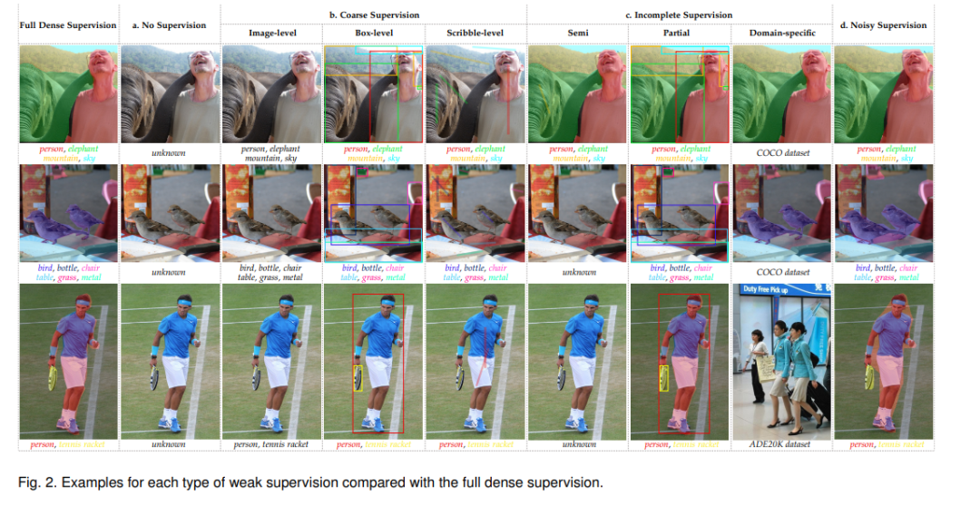 如图2和表2所示,根据粗级标注的类型,粗监督分为图像级(对每个训练图像只提供类别标签)、框级(对每个训练图像除了类别标签外,还对物体边界框进行标注)和涂鸦级(对每个训练图像中的像素子集进行标注)。粗监督分割在文献中也被称为弱监督分割。虽然从广义上讲,这个词也可以指与其他类型的弱监督的分割,如不完全监督,但我们在本节的宝贵文献之后,特指粗监督的分割。