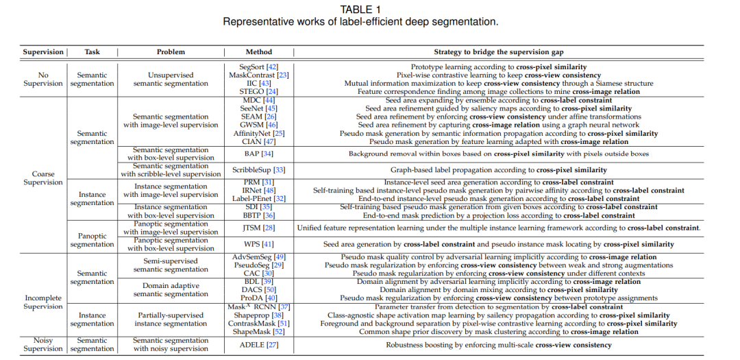 由于这些不同问题的共同挑战在于弱标签和密集预测之间的较大监督差距,我们可以从统一的角度总结出应对这些问题的策略: 如何弥合这一监督差距?这需要一些启发式先验,例如:1)跨标签约束:弱标签和密集标签之间存在自然约束,如图像级类别标签表明至少有一个像素的标签应该与该图像级类别标签相同; 2)跨像素相似性:颜色、亮度、纹理等线索高度相似的像素可能属于同一语义区域;3) 跨视图一致性: 同一图像的不同视图在密集表示和预测上都表现出一致性;4)跨图像关系:同一类别的物体在不同图像上的像素之间具有语义关系,从弱标签产生伪密集监督。从这个角度来看,很有趣的是,利用上述先验的类似策略被用于不同的分割问题,如表1所示。