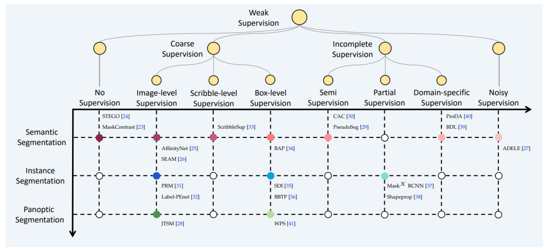 本文旨在对近年来标签高效的深度分割方法进行全面的综述。这些方法关注不同的问题。这里,一个问题被定义为一个特定的分割问题,即语义分割、实例分割和全景分割,具有某种类型的弱监督。为了将这些方法组织起来解决各种各样的问题,我们需要解决两个问题:1)如何建立这些方法的分类?2)如何从统一的角度总结这些方法所使用的策略?我们注意到,弱标记的类型是设计高效标记分割方法的关键。因此,我们试图从监管薄弱的角度来回答上述两个问题。为此,我们首先给出弱监督的类型分类,它是层次化的,如图1所示。弱监督包括的类型: