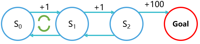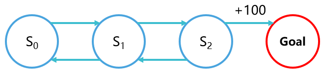 如果智能体从 出发,我们希望它到达goal,但是只有到达的那一步才会有一些奖励(+100),我们把这个称为MDP(需要说明,为了更加简单地描述问题,我们考虑折扣因子