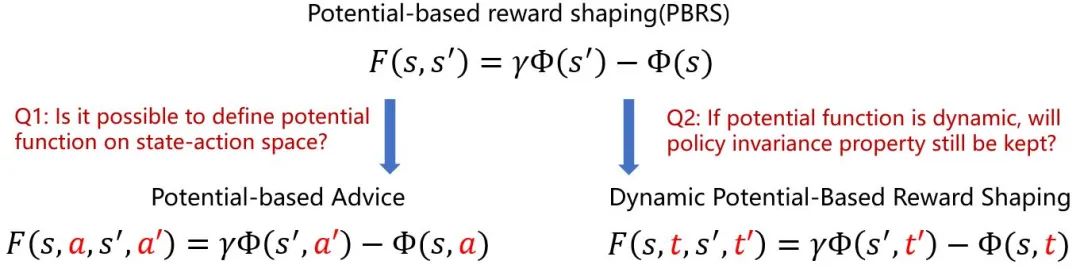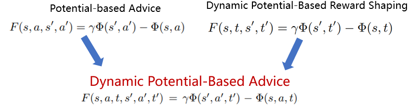 首先,他把之前讲到的Potential-based Advice和Dynamic Potential-Based Reward Shaping结合起来,得到了Dynamic Potential-Based Advice