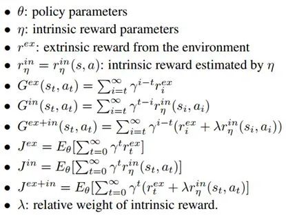 总的来说也是通过外在奖励优化内在奖励,并使用外在奖励和内在奖励的和更新策略,具体的符号约定如下