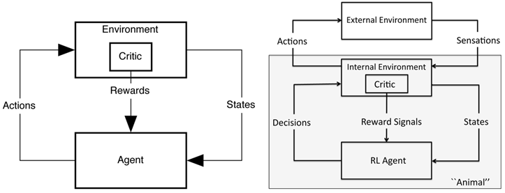 ……强化学习智能体并不一定是一个完整的生物或机器人,它可以是一个更大的行为系统的一部分。这意味着收益信号可能被更大的行动智能体内部的事情所影响,例如动机、记忆、想法甚至幻觉。收益信号可能也依赖于学习过程本身的一些性质,比如衡量学习中进步了多少。让收益信号对这样的内部信息敏感,可以使智能体作为“认知架构”的一部分,学习如何控制认知架构,同时也可以获取一些特定的知识和技能,这些技能很难只依赖于外部的收益信号学习到。这种可能性导致了“内在激励的强化学习”这个思想……
