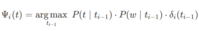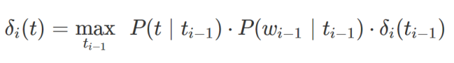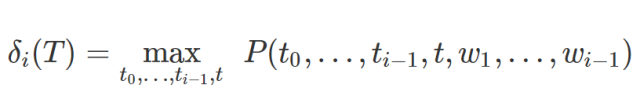 定义在时刻 i 状态为 t 的所有单个路径中概率最大值为 δ,维特比算法可以通过使用马尔科夫假设和如下定义的两个函数计算上式单个路径的最大值。