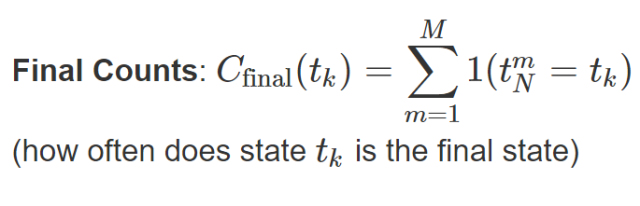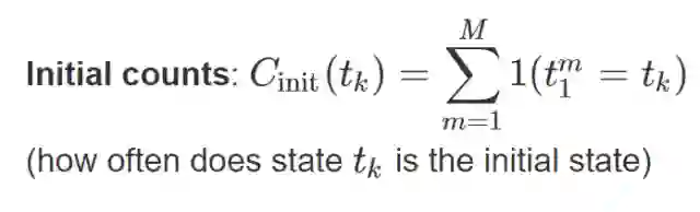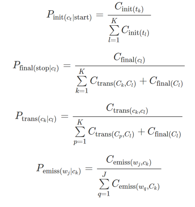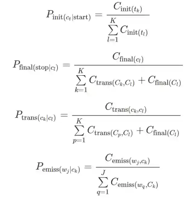 过程为:计算每个事件在语料库中出现的次数,然后将次数归一化以形成适当的概率分布。我们需要对每个事件在语料库中出现的次数计算 4 次: