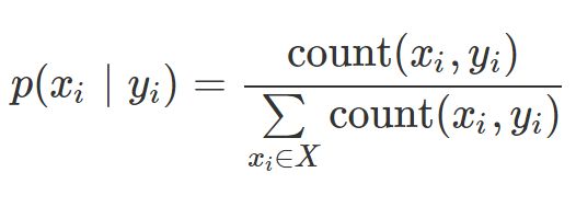 为了计算似然度估计,我们需要计算 x_i 和 y_i 一同出现的次数占 y_i 所出现次数的比率,来估计在 y_i 出现的情况下,x_i 出现的概率: