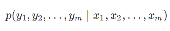 在这种序列预测问题中,数据由(x, y)的序列组成,即一个样本可描述为(x_1, x_2,...,x_m,y_1, y_2, ..., y_m)。我们要学习的是在给定一个 x 的序列下,各种 y 序列的概率是多少,即: