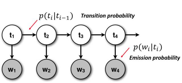 每一个观察结果变量 w_i 仅依赖于当前状态 t_i。