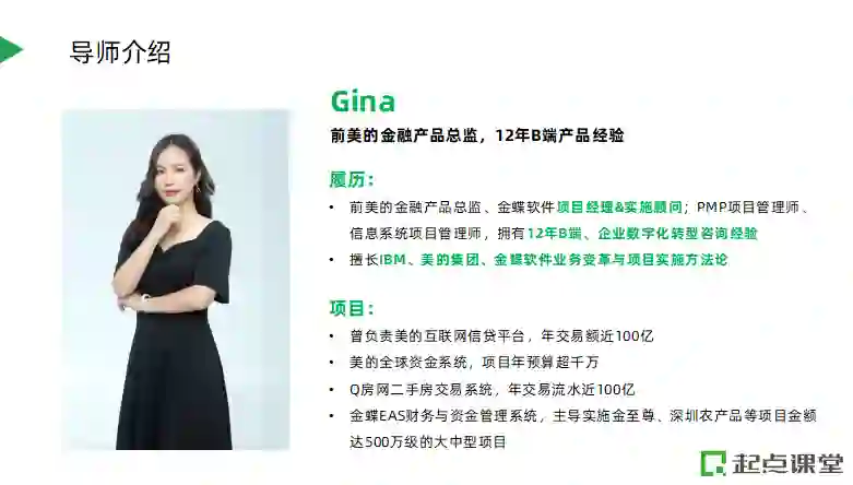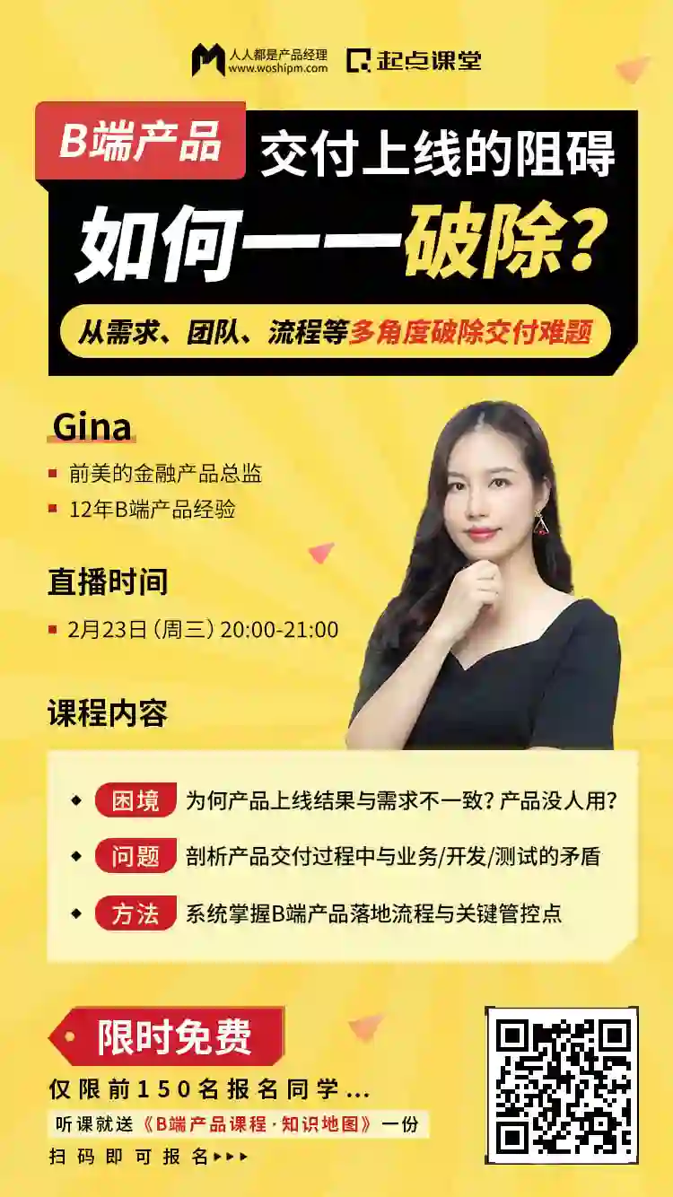 这是由起点课堂出品的B端产品公开课,专为正在做B端产品同学,或者对B端产品感兴趣想要了解相关工作内容的同学打造,课程将由前美的金融产品总监@Gina老师直播授课。