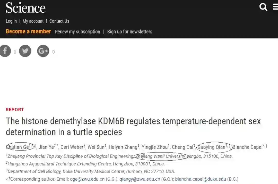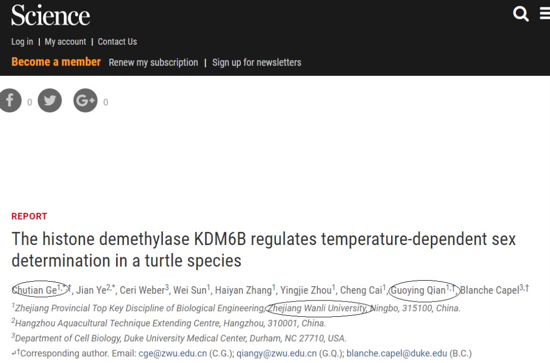 近日,浙江万里学院钱国英、葛楚天教授团队与美国杜克大学Blanche Capel教授团队合作,在龟鳖动物性别决定研究领域取得重要进展。5月11日,该研究成果以 “The histone demethylase KDM6B regulates temperature-dependent sex determination in a turtle species” (组蛋白去甲基化酶KDM6B调控一种龟的温度依赖型性别决定)为题,发表在国际顶级学术期刊Science(《科学》)上。
