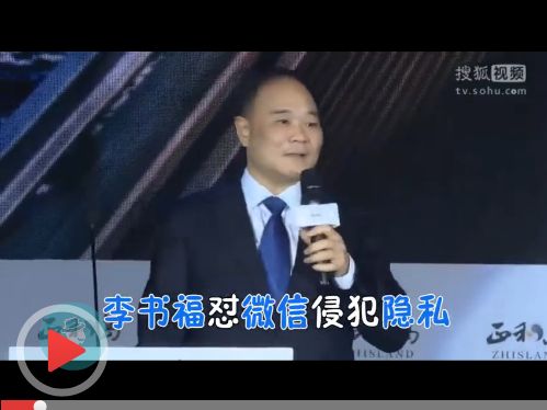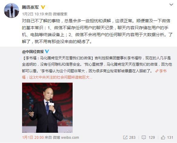 1 月 1 日,李书福在公开场合直接炮轰微信侵犯隐私,“马化腾肯定天天在看我们的微信。因为他都可以看的,随便看,这些问题非常大。”他指出,在中国没有任何隐私保护和信息安全可言,开车在路上走到处都是摄像头,“所以我很少开车上路,我相信很多人都跟我一样”。此外他提到,在国外居民可以利用法律手段来维护自己的隐私权益,而在国内往往是行不通的。