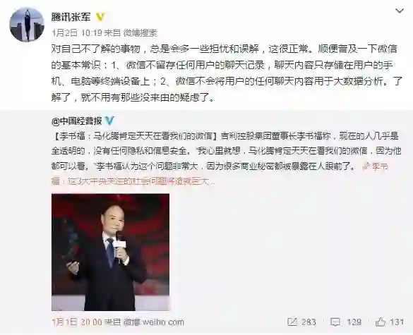 “马化腾他肯定天天在看我们的微信”——在 2018 正和岛新年论坛上,浙江吉利控股集团董事长李书福谈到隐私和信息安全话题时如是说。舆论哗然之下,业界纷纷表示细思恐极。