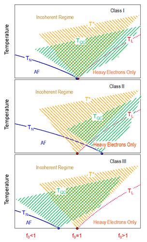 图3:三类重费米子材料、两类量子临界点及其相应的量子临界涨落示意图。其中f0表征杂化强度,T*为相干温度,TQC为磁性量子临界区的上边界,阴影示意两类不同的量子涨落,TL之下f电子完全巡游。