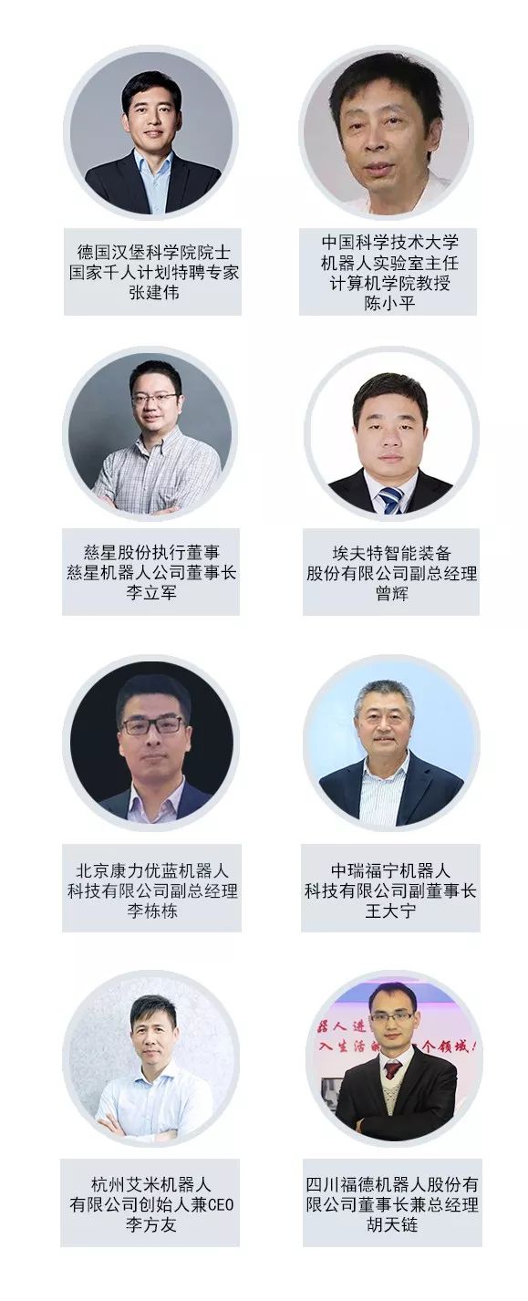 德国汉堡科学院院士、国家千人计划特聘专家张建伟,中国科学技术大学机器人实验室主任、计算机学院教授陈小平,宁波慈星机器人技术有限公司董事长李立军,埃夫特智能装备股份有限公司副总经理曾辉,中瑞福宁机器人科技有限公司副董事长王大宁,四川福德机器人股份有限公司董事长兼总经理胡天链,杭州艾米机器人有限公司CEO李方友,北京康力优蓝机器人科技有限公司副总经理李栋栋等近60位机器人行业知名专家和细分方向龙头企业领导将应邀出席。