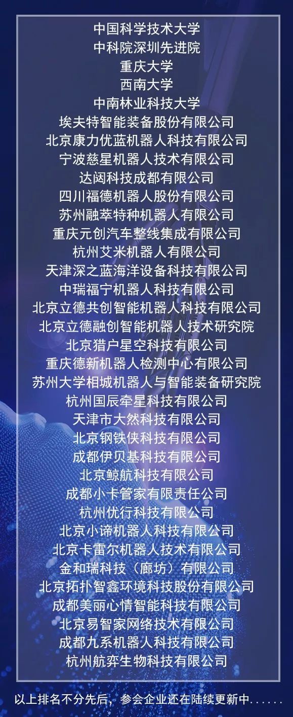 会议邀请到了近50家机器人和人工智能领域的龙头企业和新锐企业,包括工业机器人龙头企业埃夫特、服务机器人龙头企业康力优蓝、机器人细分领域先进企业达闼科技、重庆元创、杭州艾米机器人等,涵盖了工业机器人、服务机器人和特种机器人领域的众多方向,以及人工智能领域的若干重大方向。