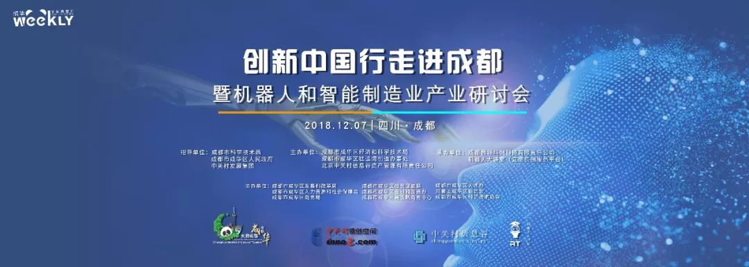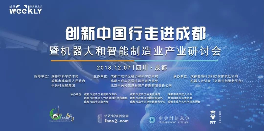 由成都市科学技术局、成都市成华区人民政府和中关村发展集团为指导单位,成都市成华区经济和科学技术局、成都市成华区猛追湾街道办事处和北京中关村信息谷资产管理有限责任公司主办,成都蓉领科创科技有限责任公司、机器人大讲堂(立德共创服务平台)承办,成都市成华区发展和改革局、成都市成华区人力资源和社会保障局、成都市成华区商务局、成都市成华区投资促进局、成都市成华区金融和国资办、成都市成华区建设路商务中心、成都市成华区人才办、共青团成华区委员会、成都市成华区科学技术协会协办的周周菁蓉汇双创系列活动之创新中国行走进成都暨机器人和智能制造产业研讨会将于12月7日于四川省成都市盛大召开。