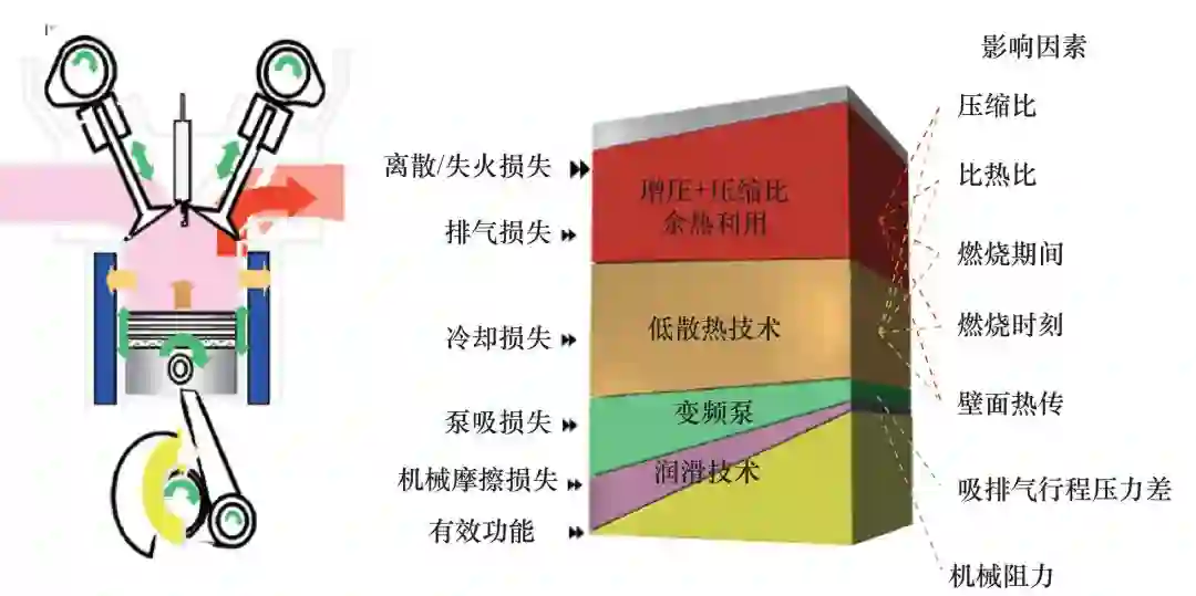 改善油耗、提高内燃机的有效热效率和七个因素有关:压缩比、比热比、燃烧期间、燃烧时刻、壁面传热、吸排行程压力差和机械阻力。发动机工作过程中的损失包括离散/失火损失、排气损失、冷却损失、泵吸损失、机械摩擦损失等(见图 5)。增压和压缩比优化控制及余热利用能够减少失火损失和排气损失,低散热技术能够减少冷却损失,可变频泵能够减少泵吸损失,润滑技术能够减少机械摩擦损失,但是如何控制综合成本是一个需要解决的问题 [21]。