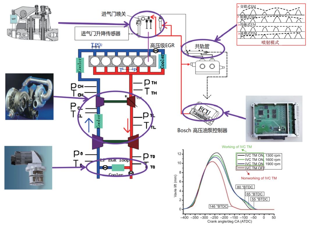 近年来,多系统、多参数可变控制技术发展迅速,加速了内燃机的智能化。其中发动机各子系统包含控制参数众多,包括增压系统(VGT 叶片和废气旁通阀开度)、喷油系统(预喷、主喷、喷油定时、喷油量)、排气再循环(EGR)系统(阀门开度和开闭时刻)、气门连杆机构 [18](气门升程、定时)等,内燃机可变智能技术包括可变增压技术,可变 EGR 技术、可变气门定时和升程技术,可变直喷和双喷技术,可变压缩比 [19,20] 技术等。