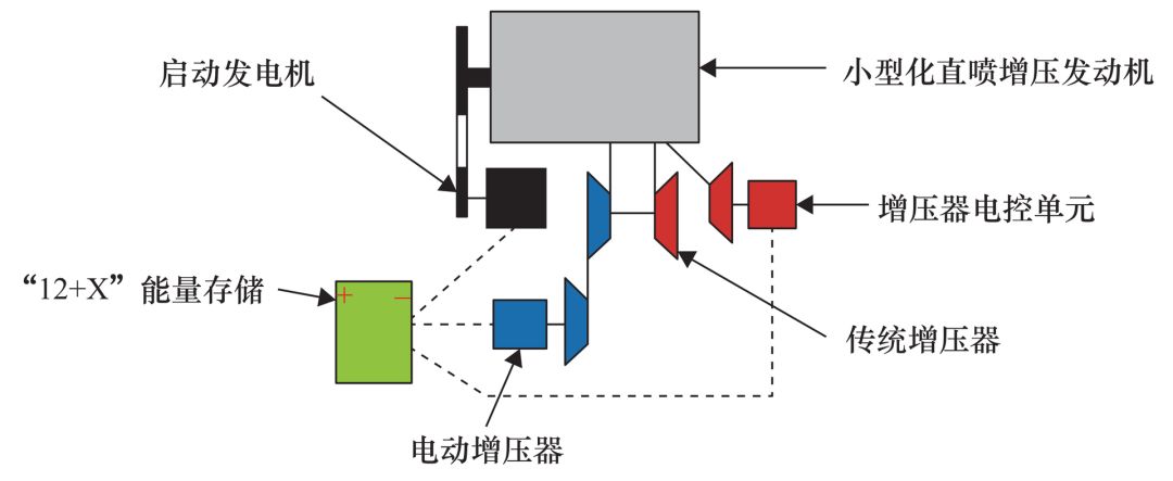 图 3 为 Ford 公司为 2.0 L 自然吸气(NA)发动机设计的复合高增压(HyBoost)系统 [13]。该系统将电动涡轮增压器与传统废气涡轮增压相结合,电动增压器能够根据发动机工况自由调节涡轮转速,达到进气充量的精确控制,同时,HyBoost 系统还能够回收内燃机高负荷时的一部分能量,极大提高低速转矩和油耗,其经济性可与强混合动力相当。