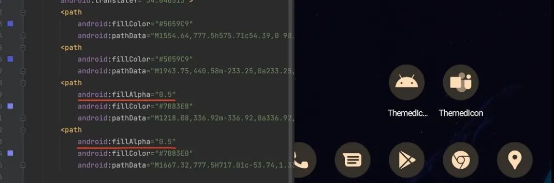 因为规格要求相近,同时为了保证在主题图标功能关闭和开启状态下都能向用户提供一致的辨识度,目前很多开发者都选择像 Google 那样直接使用现有的自适应图标素材生成 SVG 单色应用图标。适配时,只需同时提供自适应图标和单色应用图标,然后通过清单中的 <adaptive-icon> 元素指向单色应用图标即可。