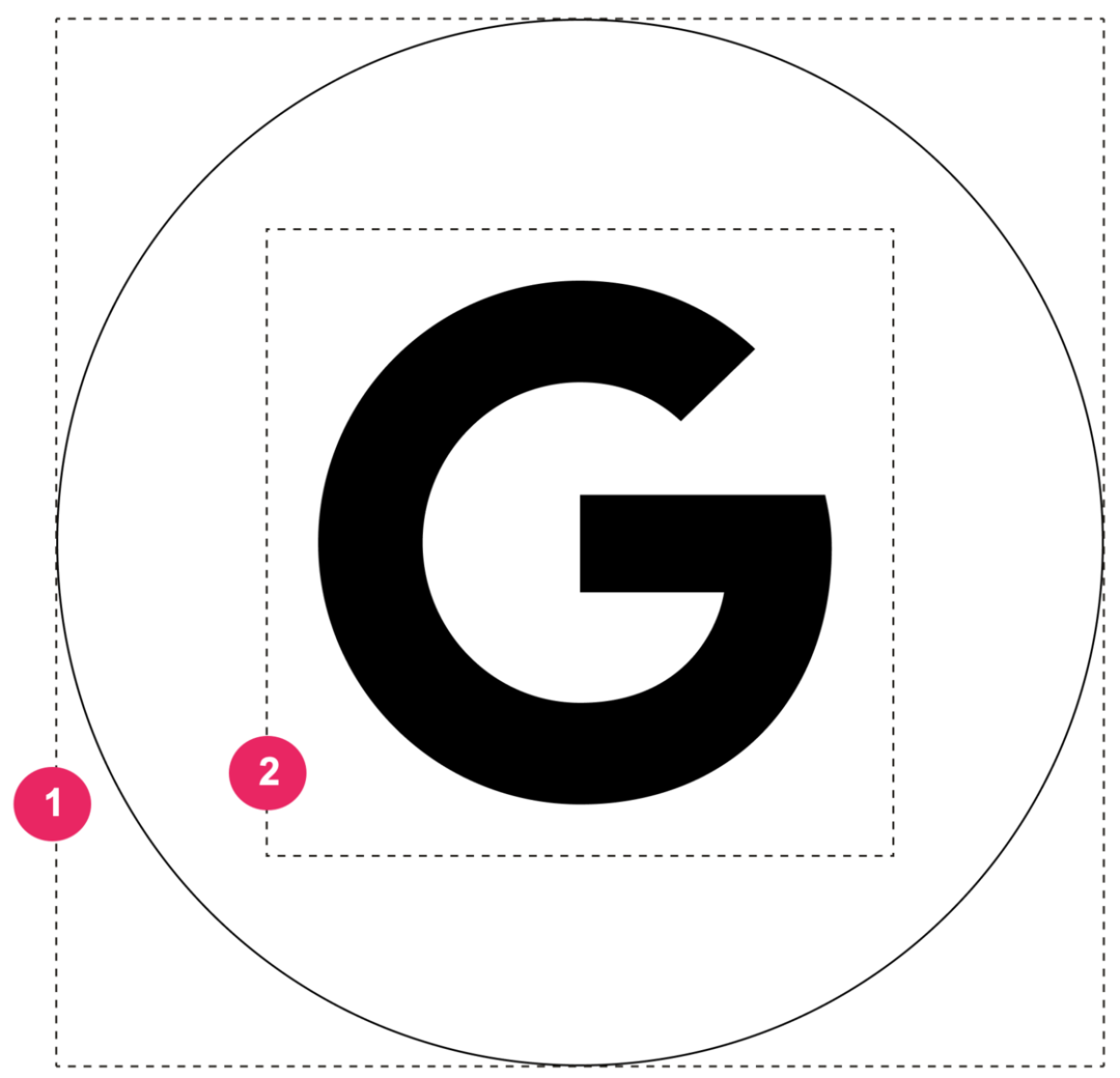 容器区域 (1) 尺寸为 108x108dp,徽标区域 (2) 建议尺寸为 44x44 dp,最大尺寸为 72x72 dp | 图:Google