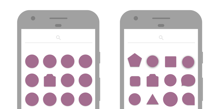 理想情况下,异形图标能够让应用图标更具辨识度,和其它应用一起放在 Android 的应用抽屉和主屏上时自然也更好找。但当屏幕上所有的图标都是形状、大小各异的图标时,用户的注意力反而更容易被特定图标的形状和设计细节所分散。