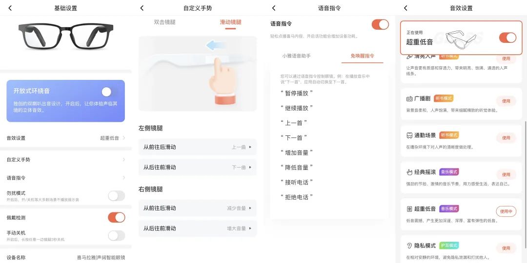 因为硬件是多喇叭,所以还有 7 种声音模式可以切换,有的适合音乐,有的适合听播客,还有适合安静环境通话的隐私模式,实测音效是有一定差异的,但因为是开放式结构,不能要求太高,指示没有快捷切换的方式,需要进入 APP 里面调节。