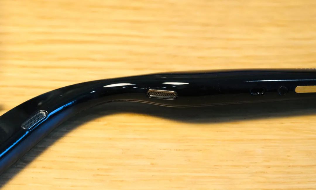 主要部件其实是镜腿部分,跟我之前试戴的同类产品大小差不多,区别是每侧有两个发声孔,一个耳前,一个耳后,据说是首创的单侧双喇叭设计,采用开放式环绕音系统,后面会体验。