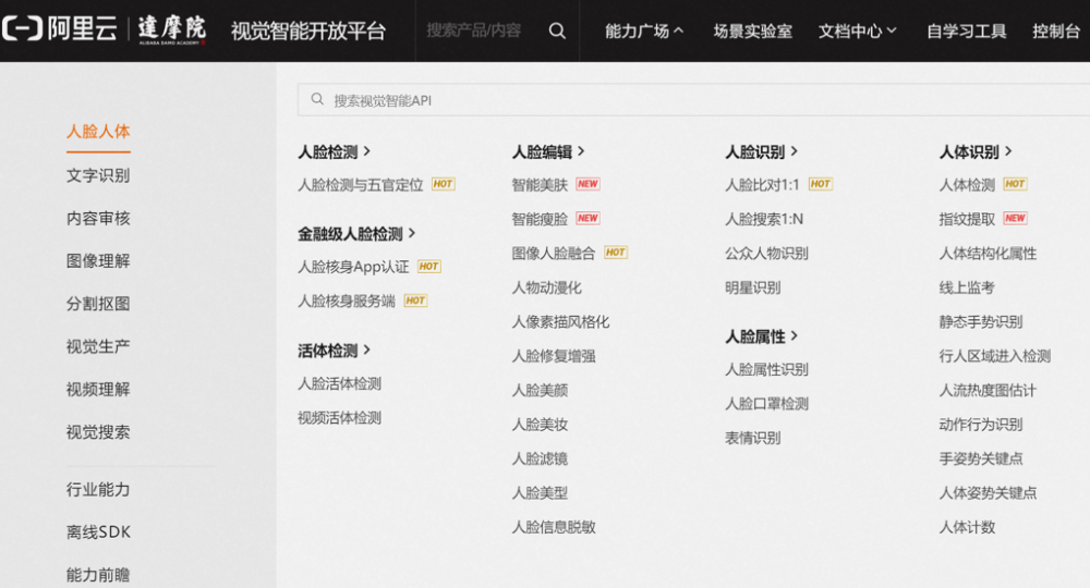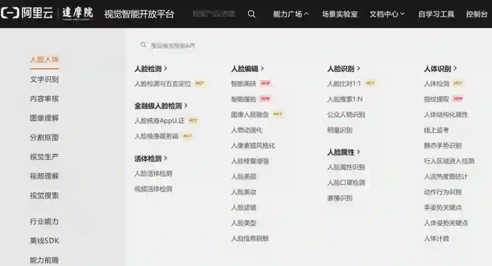达摩院在魔搭 ModelScope 之前,就率先开放了 API 形态的视觉 AI 服务,通过公共云平台对 AI 开发者提供一站式视觉在线服务平台,即视觉智能开放平台(vision.aliyun.com),其中开放了超 200 个 API,涵盖了基础视觉、行业视觉等方面,也包括上面所说的「以人为中心」的视觉技术。