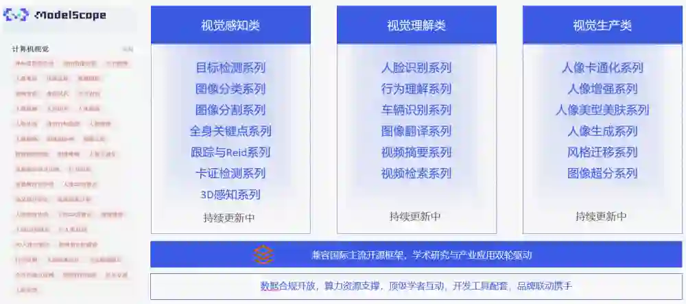 魔搭社区首批开放了主要的视觉任务模型,这些模型即有学术创新的 SOTA 技术,也有久经考验的实战模型,从「功能 / 任务」的维度上,涵盖了常见的感知、理解、生产等大类: