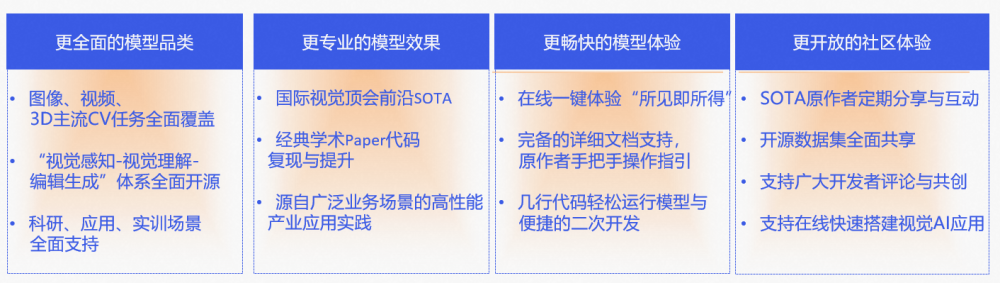 从开放视觉平台到魔搭社区,这意味着达摩院视觉 AI 的开放迈出了更大的一步。从 OpenAPI 拓展到 OpenSDK、OpenSOTA,从公共云到端云协同,从平台到社区,我们希望去满足千行百业对视觉 AI 的需求,希望促进视觉 AI 的生态发展。