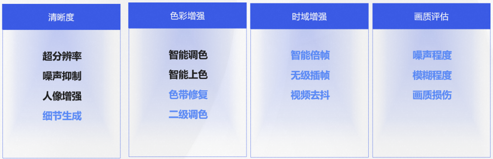 从任务分类上,可以分为:清晰度(分辨率 / 细节、噪声 / 划痕、帧率)、色彩(亮度、色偏等)、修瑕(肤质优化、去水印字幕)等,如下表: