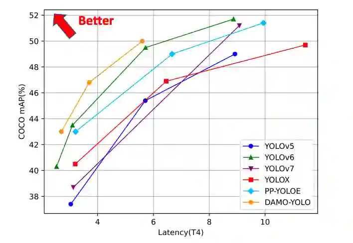 由于做了一系列优化,DAMO-YOLO 在严格限制 Latency 的情况下精度取得了显著的提升,成为 YOLO 框架中的新 SOTA。