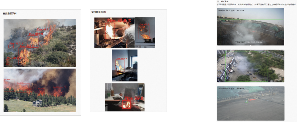 模型功能: 可做室外、室内的火焰检测以及烟雾检测,森林、城市道路、园区,卧室、办公区域、厨房、吸烟场所等,算法打磨近 2 年,并在多个客户场景实际应用,整体效果相对稳定。
