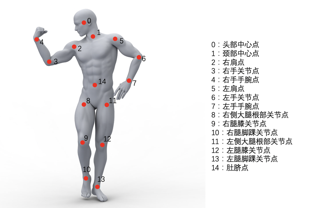 该任务采用自顶向下的人体关键点检测框架,通过端对端的快速推理可以得到图像中的 15 点人体关键点。