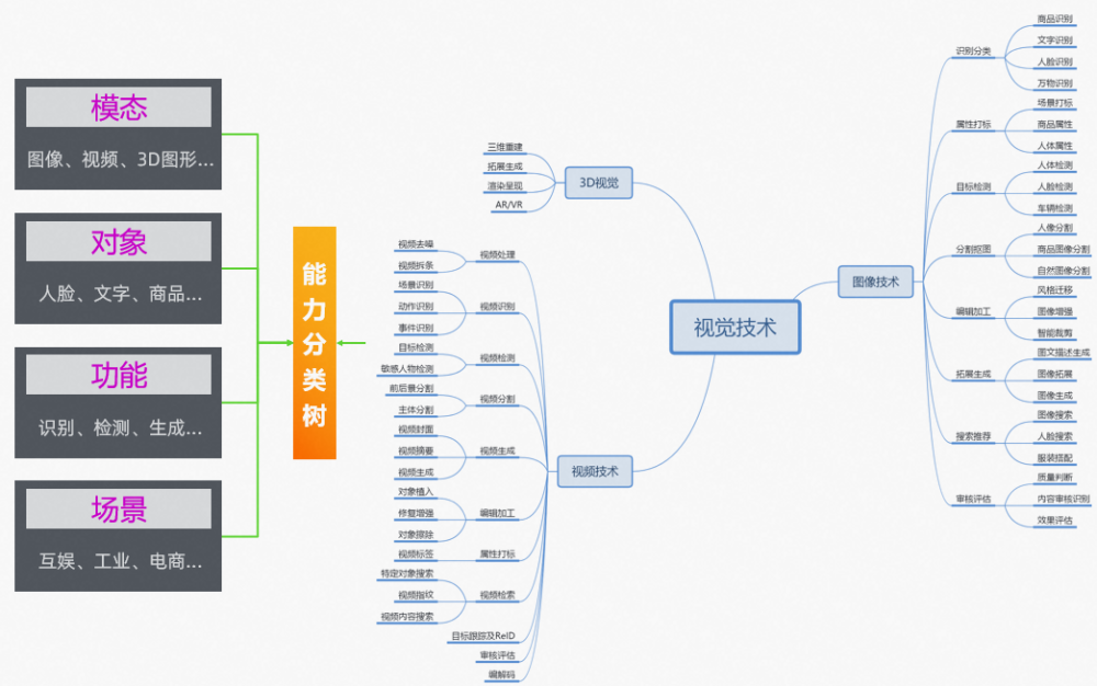 这些视觉 AI 技术,几乎覆盖了从理解到生成等各方面。因视觉技术任务众多,我们需要有一个相对合理的分类方法,可以从模态、对象、功能、场景等几个维度来分: