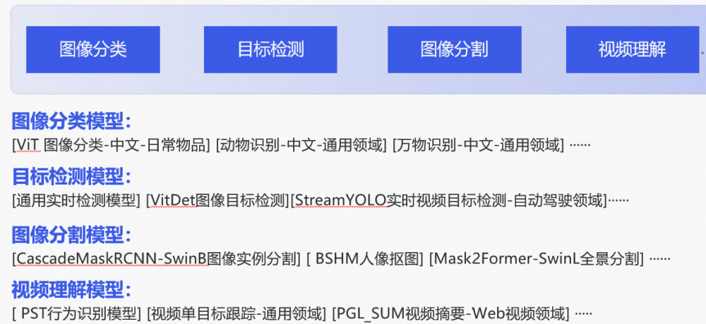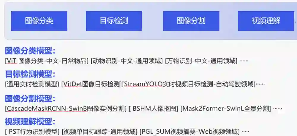 魔搭社区上面开放了丰富的感知理解类模型,供 AI 开发者试用使用: