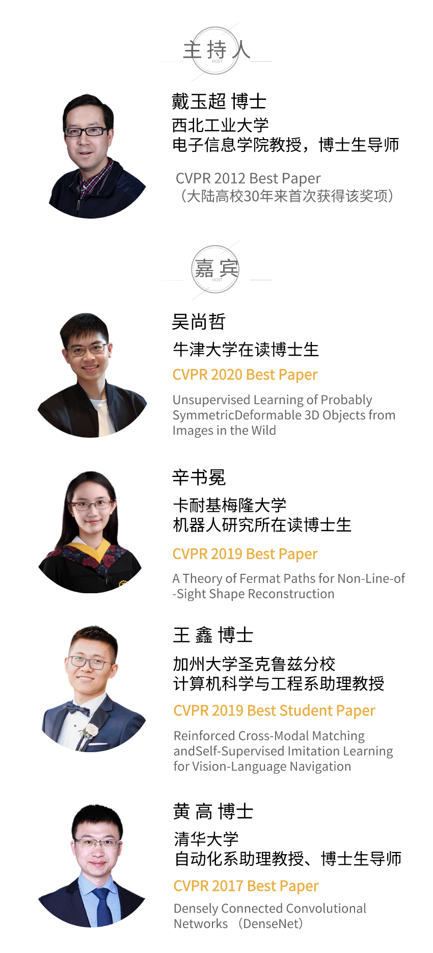 为了弥补CVPR缺失的遗憾,在这一环节我们有幸邀请到CVPR 2017、2019、2020的四位最佳论文/最佳学生论文的获奖者同场对话。最令人兴奋的是,这一环节将由西北工业大学教授、曾获CVPR2012最佳论文奖