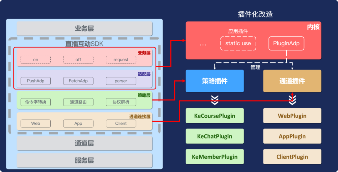 我们改造的方案是进行插件化处理,将接入层(业务层)和适配层作为 SDK 的内核抽离出来,并添加了 pluginAdaptor 对插件进行适配管理,将策略层和通道连接层的逻辑进行抽象处理,制订好对应的规范,根据抽象类和业务需求实现对应的策略插件和通道插件。