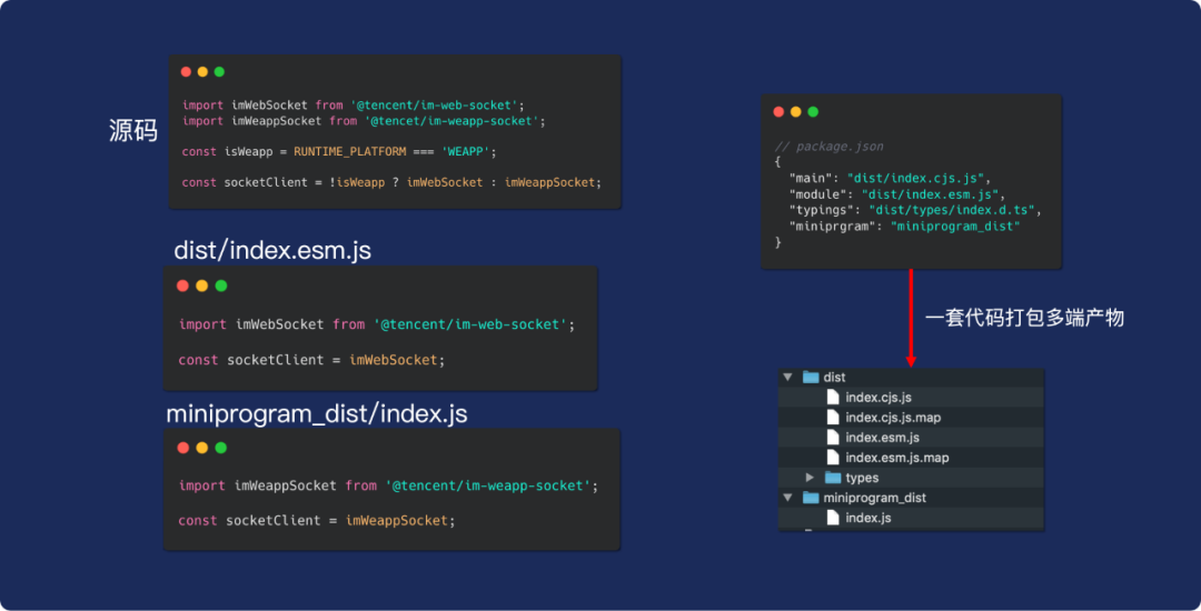 兼容性上通过 rollup 打包,在构建时注入不同的环境变量,输出对应端所需要用到的 bundle。
