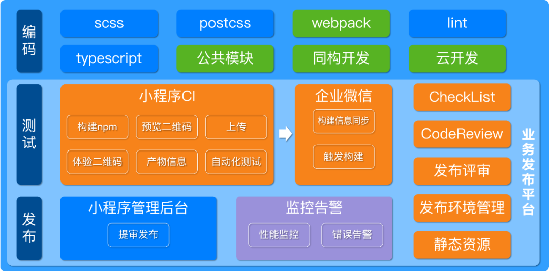 到这里我们可以看到整个技术演进的过程,它涵盖了小程序开发、构建、测试、部署发布以及监控,形成了小程序的 DevOps 开发模式,这其中具体是怎么做的呢?