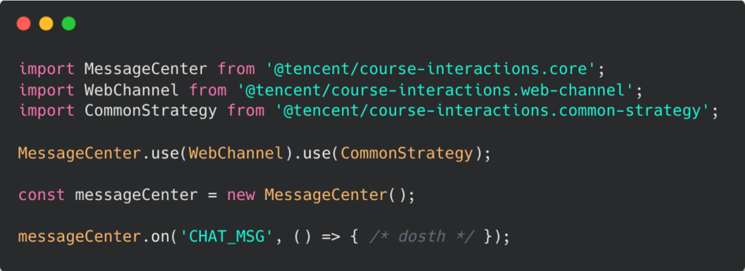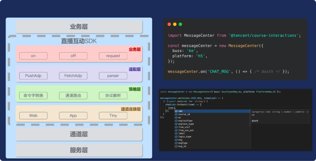 为了让这个核心能力能够达到跨端跨业务的复用效果,我们团队开发了一个直播互动的 SDK,对外抛出简单的 API,内部设计了接口层、适配层、通道层、策略层,结构非常清晰,使用起来也很方便,初始化后开发只需要监听或请求对应的命令字即可,无需关心内部的转化,并且能够利用 ts 的类型推断能力直接拿到通道返回的数据类型。